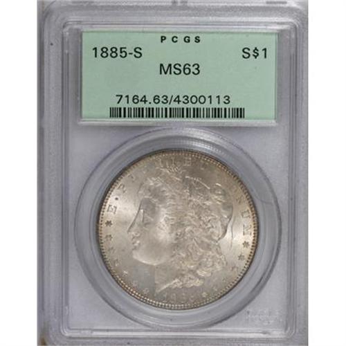 <B>1885-S $1 MS63 PCGS.</B></I> PCGS Population (2251/2170). NGC Census: (1200/1359). Mintage: 1,497,000. Numismedia Wsl. Price for NGC/PCGS coin in MS63: $250. (#7164)<BR><BR><B>Coin Engraver:</B> George T. Morgan<BR><BR><b>Shipping:</b> Coins & Currency (<a target="_blank" href="http://www.heritageauctions.com/common/shipping.php">view shipping information</a>)
