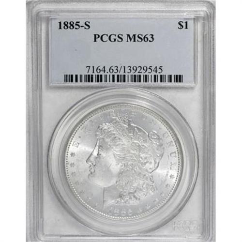 <B>1885-S $1 MS63 PCGS.</B></I> . PCGS Population (2282/2259). NGC Census: (1234/1394). Mintage: 1,497,000. Numismedia Wsl. Price for NGC/PCGS coin in MS63: $250. (#7164)<BR><BR><B>Coin Engraver:</B> George T. Morgan<BR><BR><b>Shipping:</b> Coins & Currency (<a target="_blank" href="http://www.heritageauctions.com/common/shipping.php">view shipping information</a>)