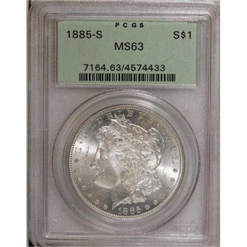 <B>1885-S $1 MS63 PCGS.</B></I> . PCGS Population (2292/2273). NGC Census: (1235/1399). Mintage: 1,497,000. Numismedia Wsl. Price for NGC/PCGS coin in MS63: $250. (#7164)<BR><BR><B>Coin Engraver:</B> George T. Morgan<BR><BR><b>Shipping:</b> Coins & Currency (<a target="_blank" href="http://www.heritageauctions.com/common/shipping.php">view shipping information</a>)