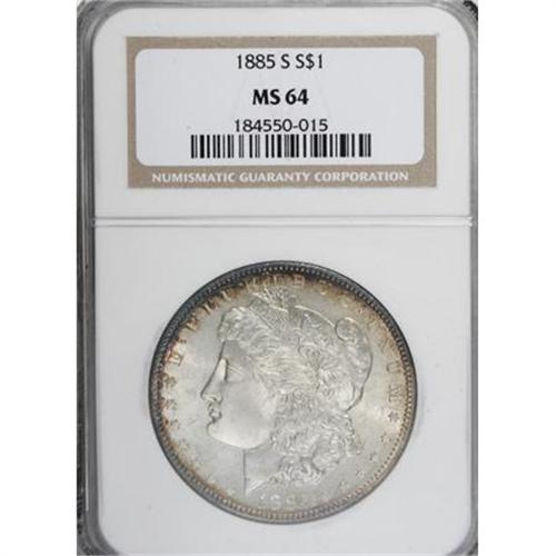 <B>1885-S $1 MS64 NGC.</B></I> . NGC Census: (1193/200). PCGS Population (1849/410). Mintage: 1,497,000. Numismedia Wsl. Price for NGC/PCGS coin in MS64: $590. (#7164)<BR><BR><B>Coin Engraver:</B> George T. Morgan<BR><BR><b>Shipping:</b> Coins & Currency (<a target="_blank" href="http://www.heritageauctions.com/common/shipping.php">view shipping information</a>)