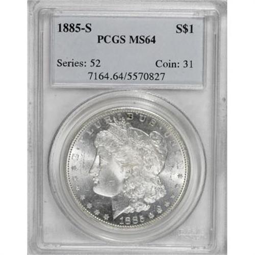 <B>1885-S $1 MS64 PCGS.</B></I> PCGS Population (1749/387). NGC Census: (1166/193). Mintage: 1,497,000. Numismedia Wsl. Price for NGC/PCGS coin in MS64: $580. (#7164)<BR><BR><B>Coin Engraver:</B> George T. Morgan<BR><BR><b>Shipping:</b> Coins & Currency (<a target="_blank" href="http://www.heritageauctions.com/common/shipping.php">view shipping information</a>)