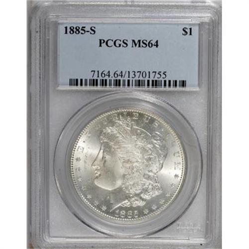 <B>1885-S $1 MS64 PCGS.</B></I> Lustrous and exactingly struck with barely a hint of gold toning. A remarkably clean near-Gem that will satisfy even the demanding collector.<BR><BR><B>Coin Engraver:</B> George T. Morgan<BR><BR><b>Shipping:</b> Coins & Currency (<a target="_blank" href="http://www.heritageauctions.com/common/shipping.php">view shipping information</a>)