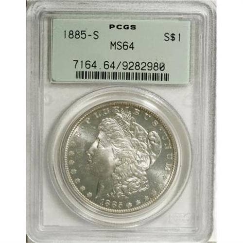 <B>1885-S $1 MS64 PCGS.</B></I> PCGS Population (1784/397). NGC Census: (1166/193). Mintage: 1,497,000. Numismedia Wsl. Price for NGC/PCGS coin in MS64: $580. (#7164)<BR><BR><B>Coin Engraver:</B> George T. Morgan<BR><BR><b>Shipping:</b> Coins & Currency (<a target="_blank" href="http://www.heritageauctions.com/common/shipping.php">view shipping information</a>)