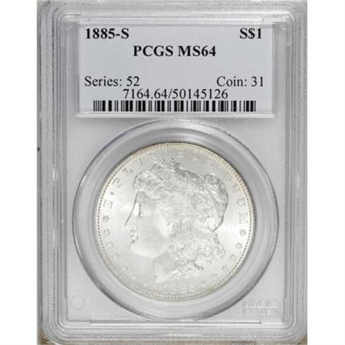 <B>1885-S $1 MS64 PCGS.</B></I> PCGS Population (1836/407). NGC Census: (1180/194). Mintage: 1,497,000. Numismedia Wsl. Price for NGC/PCGS coin in MS64: $590. (#7164)<BR><BR><B>Coin Engraver:</B> George T. Morgan<BR><BR><b>Shipping:</b> Coins & Currency (<a target="_blank" href="http://www.heritageauctions.com/common/shipping.php">view shipping information</a>)