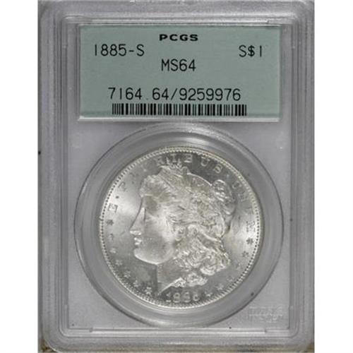 <B>1885-S $1 MS64 PCGS.</B></I> . PCGS Population (1862/411). NGC Census: (1198/201). Mintage: 1,497,000. Numismedia Wsl. Price for NGC/PCGS coin in MS64: $590. (#7164)<BR><BR><B>Coin Engraver:</B> George T. Morgan<BR><BR><b>Shipping:</b> Coins & Currency (<a target="_blank" href="http://www.heritageauctions.com/common/shipping.php">view shipping information</a>)