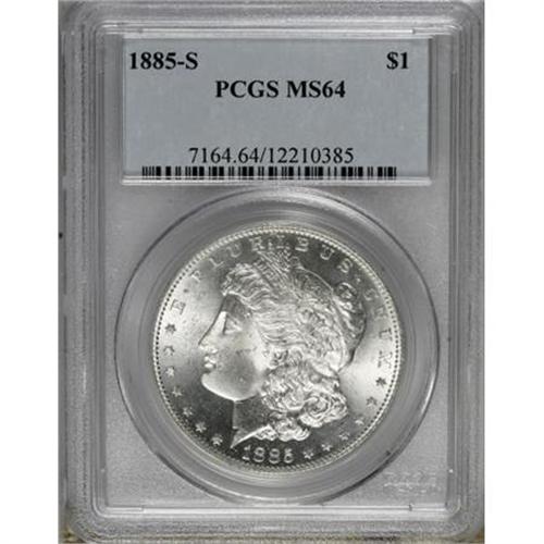 <B>1885-S $1 MS64 PCGS.</B></I> . PCGS Population (1862/411). NGC Census: (1198/201). Mintage: 1,497,000. Numismedia Wsl. Price for NGC/PCGS coin in MS64: $590. (#7164)<BR><BR><B>Coin Engraver:</B> George T. Morgan<BR><BR><b>Shipping:</b> Coins & Currency (<a target="_blank" href="http://www.heritageauctions.com/common/shipping.php">view shipping information</a>)