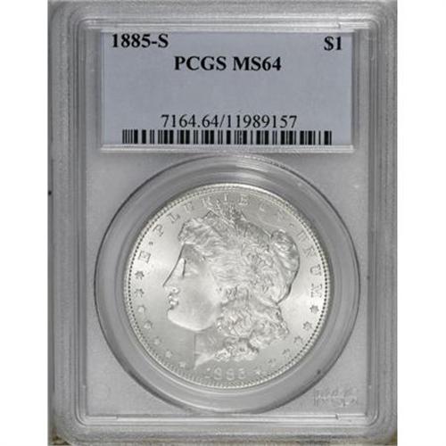 <B>1885-S $1 MS64 PCGS.</B></I> . PCGS Population (1862/411). NGC Census: (1198/201). Mintage: 1,497,000. Numismedia Wsl. Price for NGC/PCGS coin in MS64: $590. (#7164)<BR><BR><B>Coin Engraver:</B> George T. Morgan<BR><BR><b>Shipping:</b> Coins & Currency (<a target="_blank" href="http://www.heritageauctions.com/common/shipping.php">view shipping information</a>)