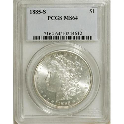 <B>1885-S $1 MS64 PCGS.</B></I> PCGS Population (1878/418). NGC Census: (1201/202). Mintage: 1,497,000. Numismedia Wsl. Price for NGC/PCGS coin in MS64: $590. (#7164)<BR><BR><B>Coin Engraver:</B> George T. Morgan<BR><BR><b>Shipping:</b> Coins & Currency (<a target="_blank" href="http://www.heritageauctions.com/common/shipping.php">view shipping information</a>)