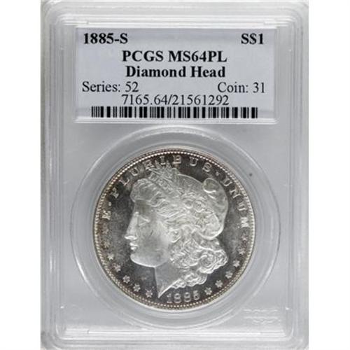 <B>1885-S $1 MS64 Prooflike PCGS.</B></I> Ex: Diamond Head. A boldly struck and flashy near-Gem with generally smooth fields and a clean portrait. Light rose-red toning visits the margins. The 1885-S is surprisingly scarce with prooflike fields, and PCGS has certified only one piece as Deep Mirror Prooflike. Population: 47 in 64 Prooflike, 9 finer (6/07).<BR><I>From the Diamond Head Registry Set of Prooflike Dollars.</B></I><BR><BR><B>Coin Engraver:</B> George T. Morgan<BR><BR><b>Shipping:</b> Coins & Currency (<a target="_blank" href="http://www.heritageauctions.com/common/shipping.php">view shipping information</a>\)