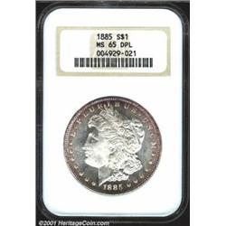 1885 S$1 MS65 Deep Mirror Prooflike NGC. Ruby-red peripheral patina frames the brilliant centers. The fields are deeply reflective and also have strong cartwheel luster. A pleasing Gem. Important notice: We expect to be auctioning lots at the rate of 200-250 per hour. Sometimes eBay Premier live bid software cannot keep up with that pace, so we strongly recommend that you place a realistic proxy bid now as insurance to avoid disappointment. Also please note that all Heritage/CAA lots purchased through eBay Premier carry a 20% Buyer's Premium.