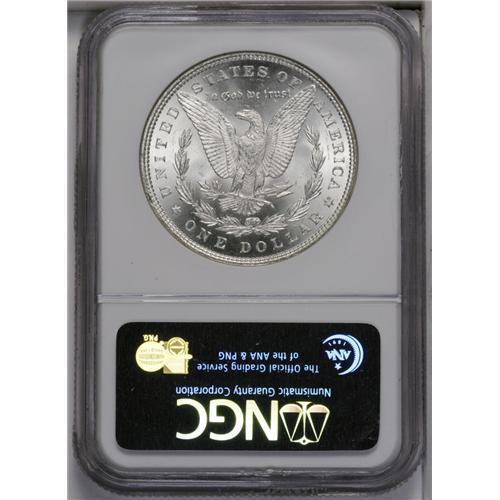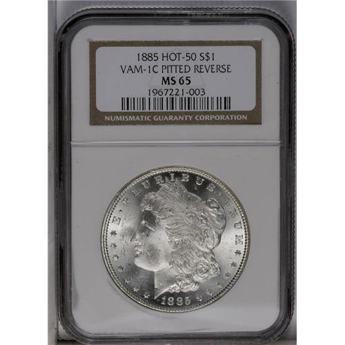 <B>1885<img border='0' src='http://www.heritagecoins.com/images/star.gif' width=10 height=10>$1> MS65 NGC.</B></I> VAM 1-C. A Hot 50 Variety. A Pitted Reverse variety, most evident beneath the fletchings in the bundle of arrows. A lustrous and slightly frosty Gem with a sharp strike. Census: 2 in 65, none finer (7/06).