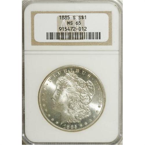 <B>1885-S $1 MS65 NGC.</B></I> VAM-2. The 5 in the date is lightly recut at the peak. This is a highly lustrous Gem with an occasional wisp of faint tan patina in localized areas. Well preserved, with just a couple of minor luster grazes on Liberty's cheek. NGC has certified a mere 12 pieces finer (6/07).<BR><I>From the Reuben Reinstein Collection.</B></I><BR><BR><b>Shipping:</b> Coins & Currency (<a target="_blank" href="http://www.heritageauctions.com/common/shipping.php">view shipping information</a>)