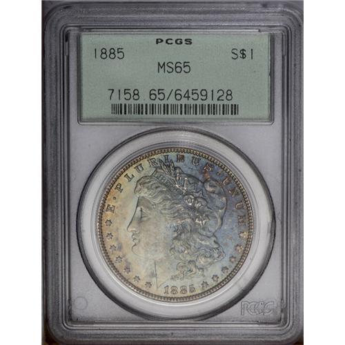 <B>1885<img border='0' src='http://www.heritagecoins.com/images/star.gif' width=10 height=10>$1> MS65 PCGS.</B></I> Well struck design features are complemented by scattered silver-gray patina with subdued azure, pale green, and gold coating the obverse. Lustrous surfaces reveal a few minor marks on Liberty's face and neck, and in the lower obverse field beneath Liberty's hair and stars 8 and 13. <BR><BR><B>Important notice:</B> Heritage usually auctions material at the rate of 200-250 lots per hour. On some occasions eBay Live bid software or the Internet may not be able to keep up with the pace of the auction. We recommend placing a realistic absentee bid now as insurance to avoid disappointment. Occasionally the auctioneer may eliminate or reject an eBay Live bid, and the auctioneer may also reopen a lot after the close of the eBay live bidding (usually because we missed an audience bid), and may reject your bid even if it shows you as the winning bidder. By bidding via eBay Live, you agree that Heritage may award the lot to another bidder at its sole discretion under the circumstances described above or any other reasonable circumstances. Since eBay bids are not shown to us until we open the lot on the floor, we treat those bids just like floor bids. In most cases the floor responds before the eBay bid is presented to us, due to Internet lag time, so for consistency we have made it a policy that floor bids are always considered first over tie eBay live bids. Also please note that all Heritage lots purchased through eBay Live carry a 20% Buyer's Premium. Please make sure you read the Terms and Conditions before you bid. This lot is being auctioned in conjunction with a live floor auction by Heritage Galleries & Auctioneers. All final auction and invoice information will be supplied by Heritage Galleries & Auctioneers, and all other information should be considered preliminary. Lot:3418 <BR><BR><B>Winning Notification and Billing:</B> After the FINAL session in this auction is complete, Heritage will send e-mail and snail mail invoices. This process normally takes several days. All final auction and invoice information will be supplied by Heritage Galleries & Auctioneers, and all other information should be considered preliminary. <BR><BR>This auction will be conducted on a live auction floor and over the Internet through eBay Live. If you choose to place an absentee bid, please take a moment to <font color='#0000ff'><u><a href='http://pages.ebay.com/liveauctions/help/before/laabsentee.html'>learn how eBay Live absentee bidding works</a></u></font><font color='#000000'>