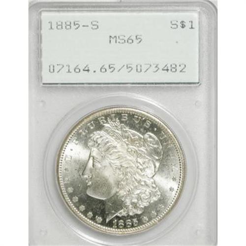 <B>1885-S $1 MS65 PCGS.</B></I> A bright, well-preserved dollar with the bold strike and active cartwheel luster that is more frequently seen on the more common 1878 through 1882 San Francisco issues. A very high-end example that is housed in an early-generation PCGS holder. Nary a mark is to be found on either side and the appeal is considerable.<BR><I>From The Motor City Collection.</B></I><BR><BR><B>Coin Engraver:</B> George T. Morgan<BR><BR><b>Shipping:</b> Coins & Currency (<a target="_blank" href="http://www.heritageauctions.com/common/shipping.php">view shipping information</a>)