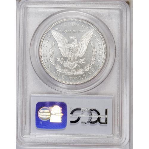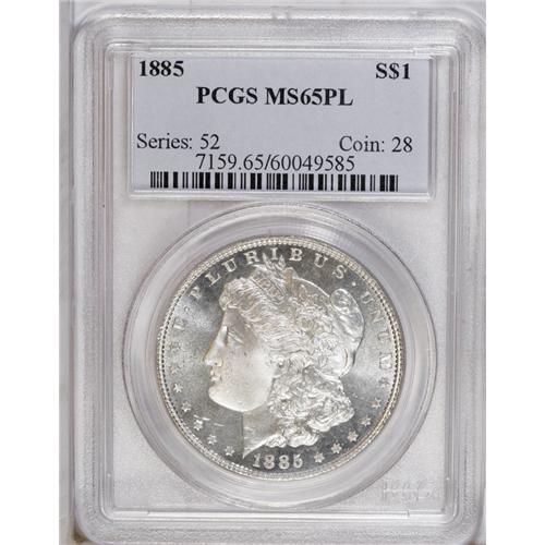 <B>1885<img border='0' src='http://www.heritagecoins.com/images/star.gif' width=10 height=10>$1> MS65 Prooflike PCGS.</B></I> A blush of rose on Liberty's cheek adds color to this otherwise untoned Gem. Attractive luster and a sharp strike may be typical for the issue, but this piece is above average in both categories.<BR><I>From The Chicago-Ark Collection.</B></I>