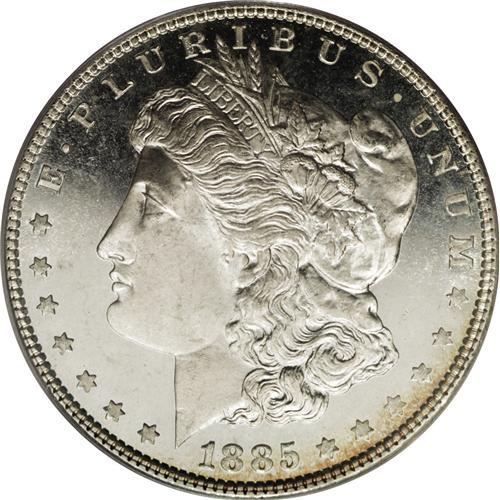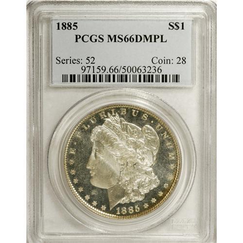 <B>1885 S$1 MS66 Deep Mirror Prooflike PCGS.</B></I> Both sides offer profound depth of mirrored reflectivity with strongly struck major devices that have escaped all but a few insignificant abrasions. A thin slice of golden toning glances across the borders of both obverse and reverse on this otherwise untoned Premium Gem. Population: 59 in 66, 1 finer (12/06).<BR><BR><b>Shipping:</b> Coin/Currency (<a target="_blank" href="http://www.heritageauctions.com/common/shipping.php">view shipping information</a>)