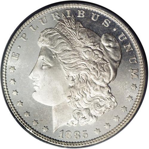 <B>1885<img border='0' src='http://www.heritagecoins.com/images/star.gif' width=10 height=10>$1 MS66 Deep Mirror Prooflike PCGS.</B></I> Refreshingly unmarked save for a small diagonal cut on the eagle's breast, with stark contrast between fields and devices. The 1885 is among the more obtainable Morgan Dollar issues with DMPL qualities, but the vast majority fall far short of the MS66 grade level. Population: 58 in 66 Deep Mirror Prooflike, 1 finer (1/06).