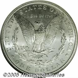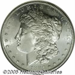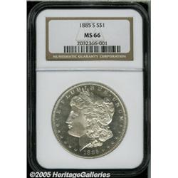 <B>1885-S<img border='0' src='http://www.heritagecoins.com/images/star.gif' width=10 height=10>$1 MS66 NGC.</B></I> This is a fully brilliant and sharply struck Gem example without any evidence of toning on either side. It has bright silver surfaces with frosty devices and satiny fields, creating an attractive cameo effect, despite not qualifying as prooflike. Population: 10 in 66, 1 finer (2/05).