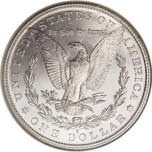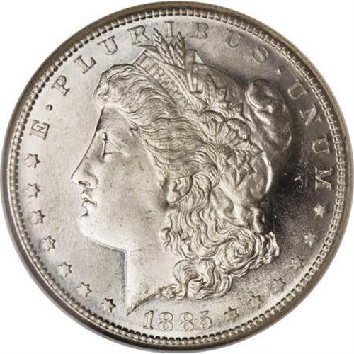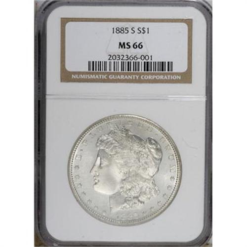 <B>1885-S $1 MS66 NGC.</B></I> <B>1885-S S$1 MS66 NGC.</B></I> This is a fully brilliant and sharply struck Gem example without any evidence of toning on either side. It has bright silver surfaces with frosty devices and satiny fields, creating an attractive cameo effect, despite not qualifying as prooflike. In spite of the numerous '85-S dollars in the Redfield Hoard, MS66 coins (by today's standards) were virtually non-existent. It would be interesting to know the pedigree of this coin.<BR><BR><b>Shipping:</b> Coins & Currency (<a target="_blank" href="http://www.heritageauctions.com/common/shipping.php">view shipping information</a>)
