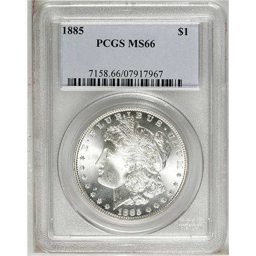 <B>1885<img border='0' src='http://www.heritagecoins.com/images/star.gif' width=10 height=10>$1> MS66 PCGS.</B></I> A virtually untoned Premium Gem with excellent luster and a bold strike. The fields are clean, though a thin, shallow abrasion is noted on Liberty's cheek.