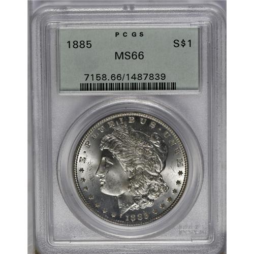 <B>1885<img border='0' src='http://www.heritagecoins.com/images/star.gif' width=10 height=10>$1> MS66 PCGS.</B></I> Exceedingly clean fields are lustrous and practically untoned. Well struck with only a small luster break at the truncation keeping this piece from an even higher grade.<BR><I>From The Chicago-Ark Collection.</B></I>