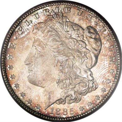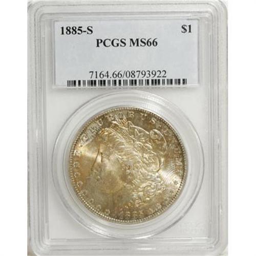 <B>1885-S $1 MS66 PCGS.</B></I> The 1885-S fits into the midrange echelon of Morgan dollars, neither common nor extremely rare. Few are seen so fine as the present example, however. PCGS has certified 25 coins in MS66, with only two finer (7/07). This specimen displays consistent, lovely lilac-gold toning on the obverse, with a brilliant reverse. Remains of a couple of ancient fingerprints resolve into the obverse toning, but otherwise the coin offers much appeal. <BR><BR><B>Coin Engraver:</B> George T. Morgan<BR><BR><b>Shipping:</b> Coins & Currency (<a target="_blank" href="http://www.heritageauctions.com/common/shipping.php">view shipping information</a>)