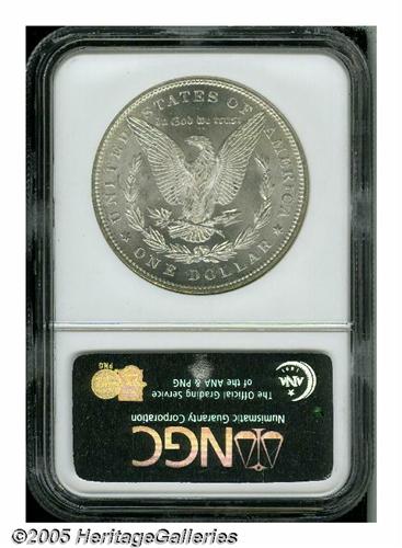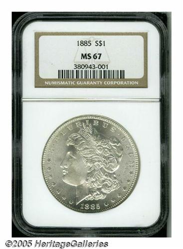 <B>1885<S$1> MS67 NGC.</B></I> An essentially brilliant Superb Gem, the sweeping luster is unblemished by contact and even the cheek displays only the faintest grazes. The 85 in the date exhibit minor repunching. As of (3/05), NGC and PCGS have certified a mere 3 pieces finer.
