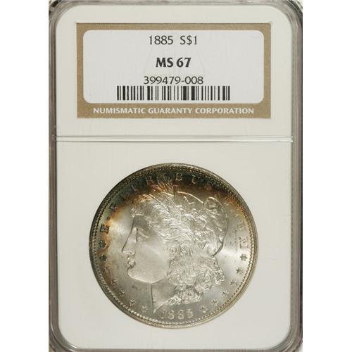 <B>1885 S$1 MS67 NGC.</B></I> Blushes of golden-brown, ruby-red, and navy-blue patina grace the peripheries. This razor-sharp Superb Gem has a remarkably clean cheek, and the reverse is also beautifully preserved.<BR><BR><b>Shipping:</b> Coins & Currency (<a target="_blank" href="http://www.heritageauctions.com/common/shipping.php">view shipping information</a>)