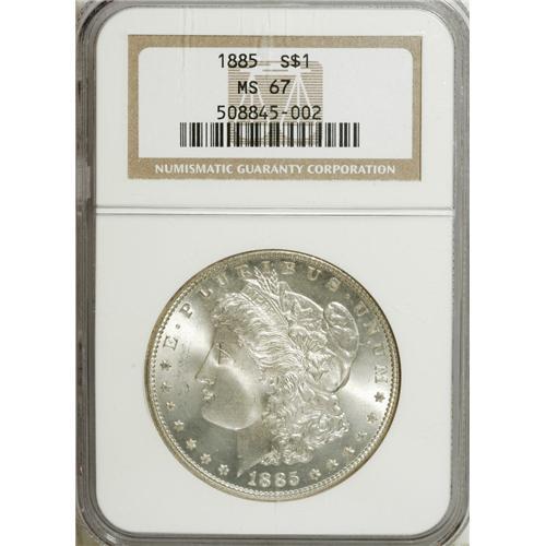1885 S$1 MS67 NGC. Subliminal gold toning is barely vi