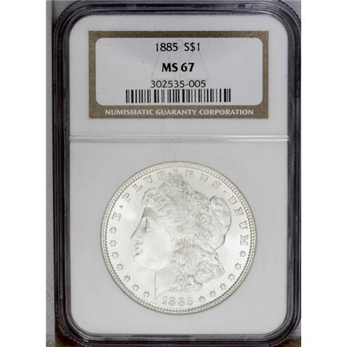 <B>1885<img border='0' src='http://www.heritagecoins.com/images/star.gif' width=10 height=10>$1> MS67 NGC.</B></I> While the 1885 dollar is readily available at the Gem and Premium Gem levels, MS67 coins are more challenging; fewer than 200 such pieces have been certified by NGC and PCGS, and a mere five specimens finer (3/06). Essentially untoned surfaces display dazzling luster and well impressed motifs, and are well preserved, save for some small contact marks on the cheek. <BR><BR><B>Important notice:</B> Heritage usually auctions material at the rate of 200-250 lots per hour. On some occasions eBay Live bid software or the Internet may not be able to keep up with the pace of the auction. We recommend placing a realistic absentee bid now as insurance to avoid disappointment. Occasionally the auctioneer may eliminate or reject an eBay Live bid, and the auctioneer may also reopen a lot after the close of the eBay live bidding (usually because we missed an audience bid), and may reject your bid even if it shows you as the winning bidder. By bidding via eBay Live, you agree that Heritage may award the lot to another bidder at its sole discretion under the circumstances described above or any other reasonable circumstances. Since eBay bids are not shown to us until we open the lot on the floor, we treat those bids just like floor bids. In most cases the floor responds before the eBay bid is presented to us, due to Internet lag time, so for consistency we have made it a policy that floor bids are always considered first over tie eBay live bids. Also please note that all Heritage lots purchased through eBay Live carry a 20% Buyer's Premium. Please make sure you read the Terms and Conditions before you bid. This lot is being auctioned in conjunction with a live floor auction by Heritage Galleries & Auctioneers. All final auction and invoice information will be supplied by Heritage Galleries & Auctioneers, and all other information should be considered preliminary. Lot:3421 <BR><BR><B>Winning Notification and Billing:</B> After the FINAL session in this auction is complete, Heritage will send e-mail and snail mail invoices. This process normally takes several days. All final auction and invoice information will be supplied by Heritage Galleries & Auctioneers, and all other information should be considered preliminary. <BR><BR>This auction will be conducted on a live auction floor and over the Internet through eBay Live. If you choose to place an absentee bid, please take a moment to <font color='#0000ff'><u><a href='http://pages.ebay.com/liveauctions/help/before/laabsentee.html'>learn how eBay Live absentee bidding works</a></u></font><font color='#000000'>
