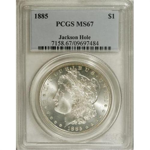 <B>1885 $1 MS67 PCGS.</B></I> Ex: Jackson Hole. As with most of the readily available Morgan issues, the 1885 comes in varying degrees of quality, but this exquisitely preserved Superb Gem has eye appeal in spades, with vibrant luster and boldly defined devices that display just a hint of rose patina. PCGS has graded only one coin finer (6/07).<BR><BR><b>Shipping:</b> Coins & Currency (<a target="_blank" href="http://www.heritageauctions.com/common/shipping.php">view shipping information</a>)