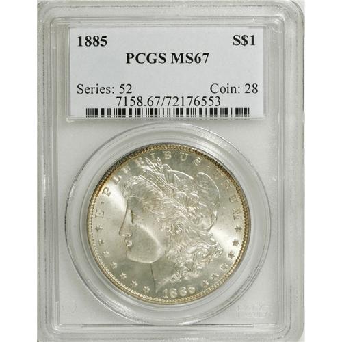 <B>1885 S$1 MS67 PCGS.</B></I> The design elements are well impressed throughout on this lovely Morgan dollar. Lightly toned, with just a touch of rose-gold color on each side. The lustrous surfaces are virtually pristine. Population: 72 in 67, 1 finer (2/07).<BR><BR><b>Shipping:</b> Coins & Currency (<a target="_blank" href="http://www.heritageauctions.com/common/shipping.php">view shipping information</a>)