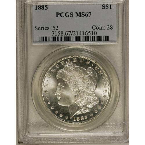 <B>1885 S$1 MS67 PCGS.</B></I> This Superb Gem Philadelphia Mint Morgan silver dollar earns its grade and then some. It is magnificently lustrous and has a razor-sharp strike with velvety devices and seemingly flawless surfaces. This coin is solid silvery-white and has eye appeal that just won't let go. Quite rare any finer. Population: 69 in 67, 1 finer (10/06).<BR><BR><b>Shipping:</b> Coin/Currency (<a target="_blank" href="http://www.heritageauctions.com/common/shipping.php">view shipping information</a>)