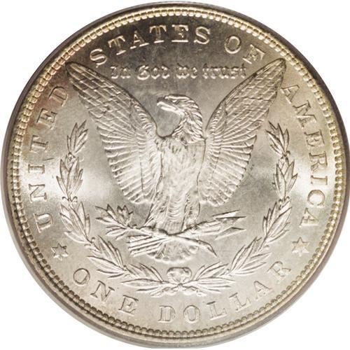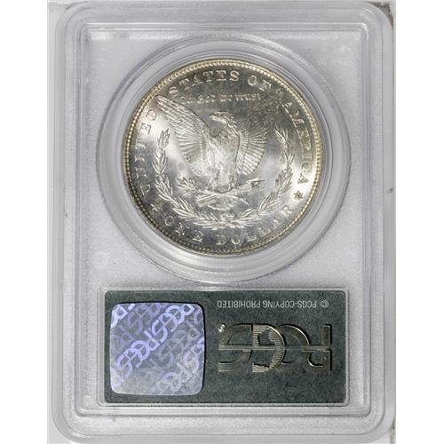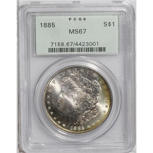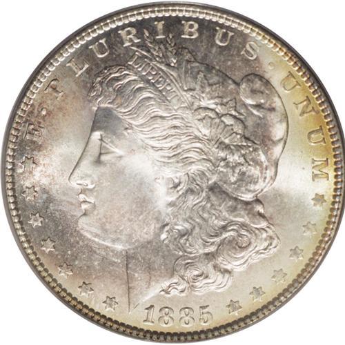 <B>1885<img border='0' src='http://www.heritagecoins.com/images/star.gif' width=10 height=10>$1> MS67 PCGS.</B></I> This is an impressive Superb Gem example with satiny silver luster and highly appealing color on the obverse. It is sharply struck and the obverse exhibits pale gold, steel, and amber color across much of the surface with evidence of brilliant silver-white color. The reverse is almost entirely brilliant with only a trace of golden-lilac toning.