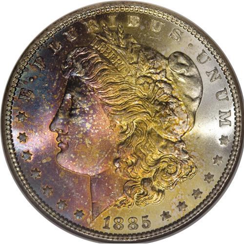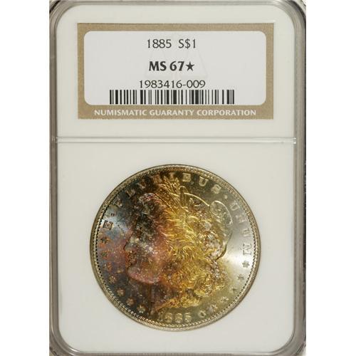 <B>1885 S$1 MS67 <img border='0' src='http://www.heritagecoins.com/images/star.gif' width=10 height=10> NGC.</B></I> Much of the obverse is toned with bright yellow, crimson, and blue color, and a much smaller part is fully brilliant silver-white. The reverse is entirely brilliant and untoned, both sides exhibiting sharp design details including the hair over Liberty's ear and the eagle's breast. Census: 10 in 67 S, 5 finer (4/07).<BR><BR><b>Shipping:</b> Coins & Currency (<a target="_blank" href="http://www.heritageauctions.com/common/shipping.php">view shipping information</a>)