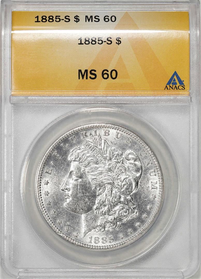 One 1885-S $1 Morgan Silver Dollar Coin ANACS MS60 . ANACS Certified.
