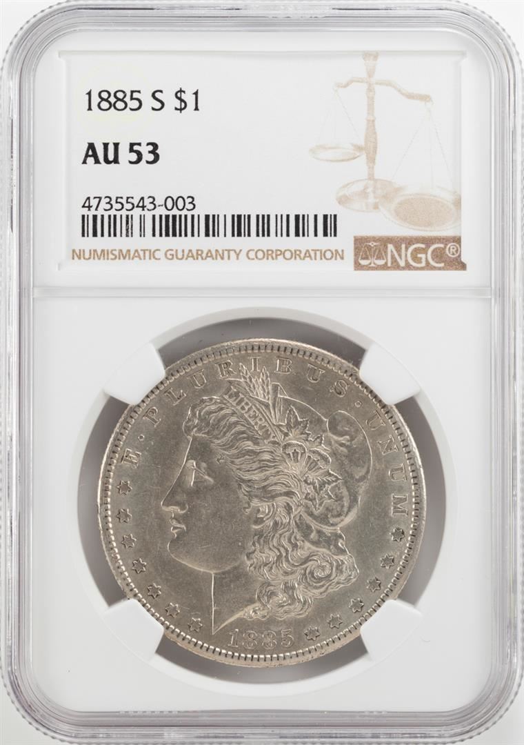 One 1885-S $1 Morgan Silver Dollar Coin NGC AU53. NGC Certified.