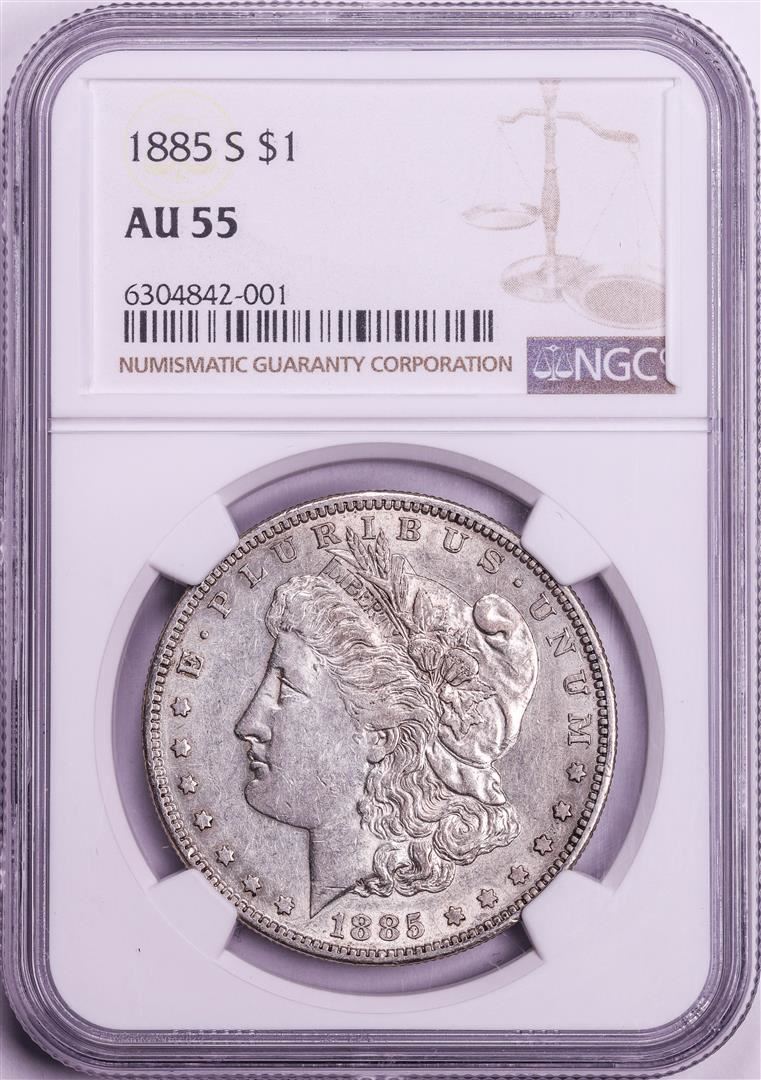 One 1885-S $1 Morgan Silver Dollar Coin NGC AU55. NGC Certified.