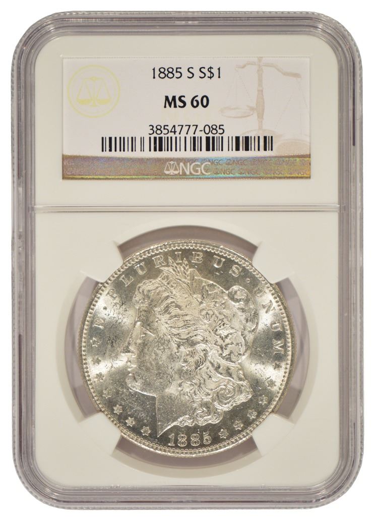 One 1885-S $1 Morgan Silver Dollar Coin NGC MS60.