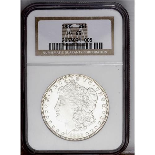 <B>1885<img border='0' src='http://www.heritagecoins.com/images/star.gif' width=10 height=10>$1 PR63 NGC.</B></I> Brilliant white with frosted devices and nice cameo contrast. The strike is razor-sharp and the surfaces exhibit minor hairlines with an outstanding presence for the grade. This coin will not displease the new owner.