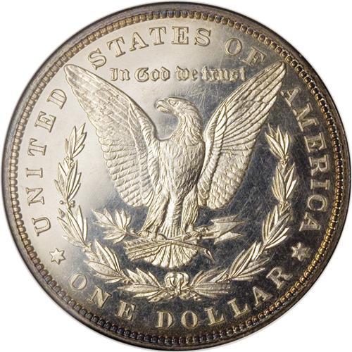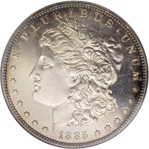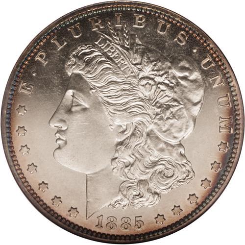 <B>1885 S$1 PR63 NGC.</B></I> Light golden-brown and cobalt-blue peripheral shades illuminate this nicely mirrored and attractive proof Morgan dollar. The strike is complete aside from minor softness just above Liberty's ear. A whisper of obverse carbon is all that limits the grade. A mere 930 proofs were produced.<BR><BR><b>Shipping:</b> Coin/Currency (<a target="_blank" href="http://www.heritageauctions.com/common/shipping.php">view shipping information</a>) <BR><BR><B>Importa