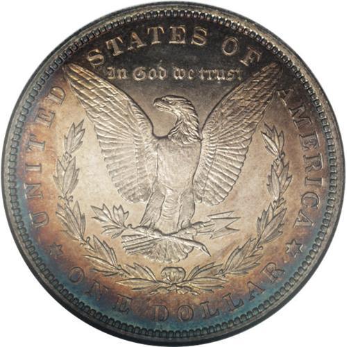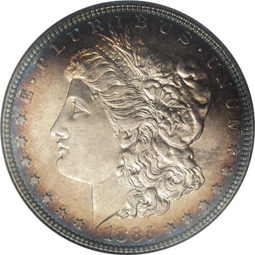 <B>1885 S$1 PR65 Cameo NGC.</B></I> A stunning Gem with excellent cameo contrast on both sides, created by the intersection of mirrored fields and lustrous devices. The centers on each side have light gold color, deepening to dark gold and vivid blue at the borders. A desirable example with a low Cameo proof population. Census: 14 in 65 Cameo, 21 finer (4/07).<BR><BR><b>Shipping:</b> Coins & Currency (<a target="_blank" href="http://www.heritageauctions.com/common/shipping.php">view shipping information</a>)