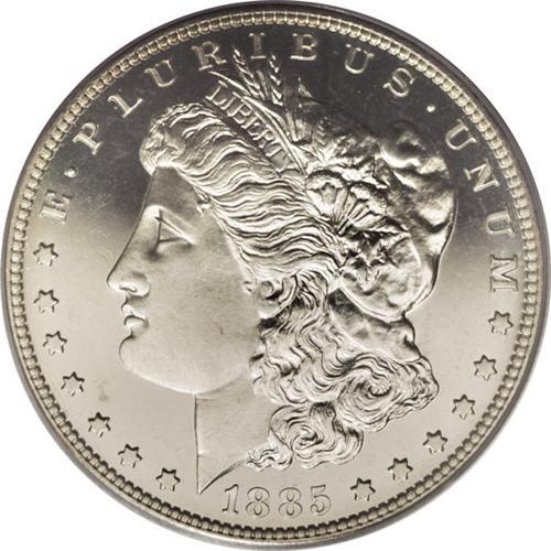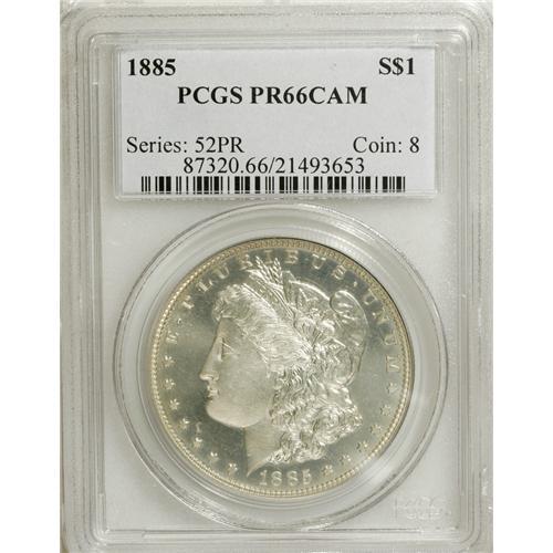 <B>1885 S$1 PR66 Cameo PCGS.</B></I> VAM-5, Doubled 85. Also listed as Breen-1 in his <I>Proof Encyclopedia.</B></I> The doubling is most apparent at the bottom of the 5, beneath the knob, and less so at the bottom of the second 8. The proof mintage of 930 pieces contrasts starkly with the enormous business strike mintage approaching 18 million pieces, yet in another way the business strikes and proofs share something in common: generally sharp strikes. Of course, the multiply struck proofs are far sharper, and they generally are found with good cameo contrast, such as on the present piece. This coin is essentially untoned, with superb silver-on-black contrast between the fields and the devices. While the VAM variety likely carries little premium as an R.3 coin, it does add extra pizzazz to this already-delightful piece. Population: 12 in 66, 0 finer (3/07).<BR><I>From The Palakika Collection.</B></I><BR><BR><b>Shipping:</b> Coins & Currency (<a target="_blank" href="http://www.heritageauctions.com/common/shipping.php">view shipping information</a>)