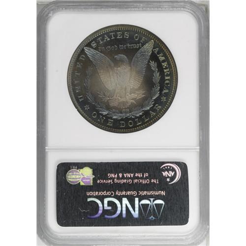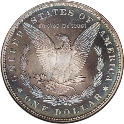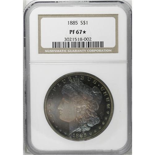 <B>1885<img border='0' src='http://www.heritagecoins.com/images/star.gif' width=10 height=10>$1> PR67 <img border='0' src='http://www.heritagecoins.com/images/star.gif' width=10 height=10> NGC.</B></I> Awarded the coveted Star designation by NGC for superior eye appeal, and well deserving of the same, this piece sports captivating light patina on each side in shades of light green, pastel rose, lilac, ice-blue, and orange. Although the colors are of moderate intensity, they fail to dampen the looking-glass fields' superb luster, which radiates from beneath the delectable palette of color. The strike is just as bold and beautiful as the toning, with nearly full hair over the ear, full venation on the leaves of the wreath, and full plumage on the eagle. Scrutiny with a loupe reveals only a single tiny contact mark over the ear, one that is all but undetectable. Finally, to sum up this piece, that most elusive and hard-to-quantify characteristic of the nicest coins, <I>eye appeal,</B></I> suffice it to say that this coin has it in spades. While catalogers struggle to find words to describe adequately such pieces, an example like the present coin instantly demonstrates that elusive hallmark of the top numismatic rarities.<BR> The proof mintage of the 1885 Morgan dollar amounted to 930 pieces, of which likely 300 or so exist today, according to the population data and including resubmissions, crossovers, and other "grading events," as Bowers calls it. Most of the extant pieces, however, average a grade around PR64 or thereabouts. There are about two dozen Gems at both services, and proofs of a higher grade are rare. While there are, amazingly, a couple of pieces that have achieved higher numerical grades, it is doubtful that they could be any more lovely or aesthetically pleasing. Census: 1 in 67 <img border='0' src='http://www.heritagecoins.com/images/star.gif' width=10 height=10>, three finer (9/06).