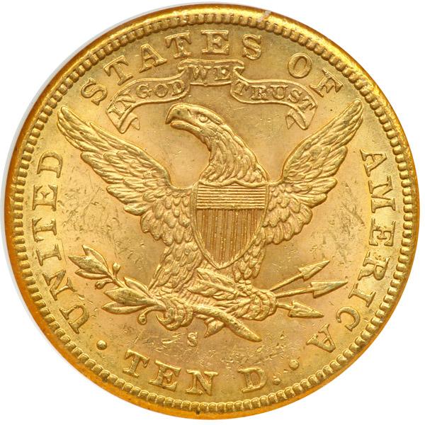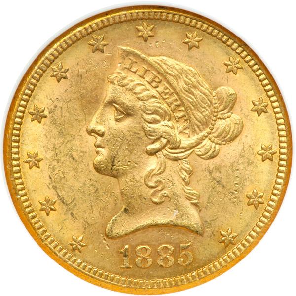 1885-S $10 Liberty. NGC graded MS-62. Nice original golden toning over frosty luster. A well struck Liberty ten (PCGS # 8707) .