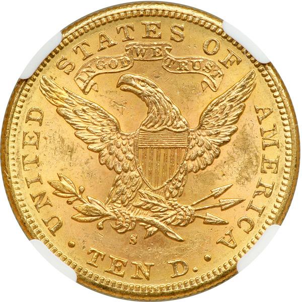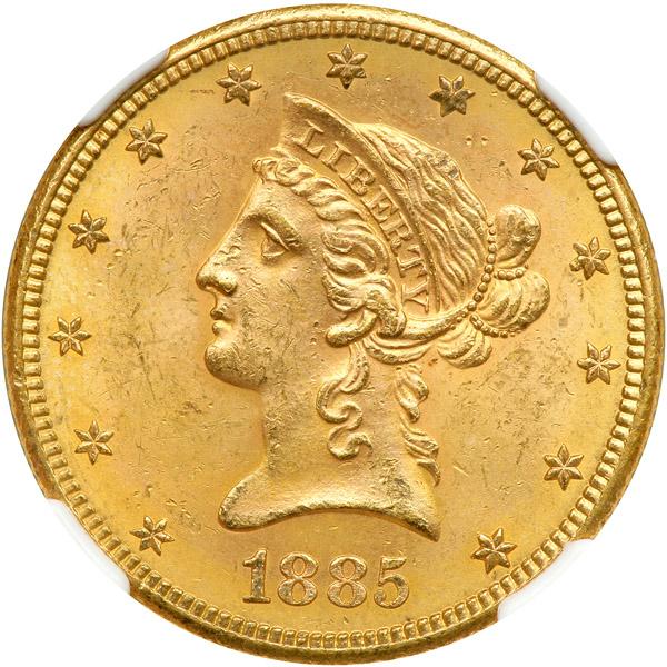 1885-S $10 Liberty. NGC graded MS-64. Tied with one other for top honors in the NGC census! Nicely toned with hues of yellow gold and pale apricot pink in the frosty luster. Broadly and well struck on the legends and main devices, which is always propitious, and with bold detail at the centers. Pop 2; none finer (PCGS # 8707) .