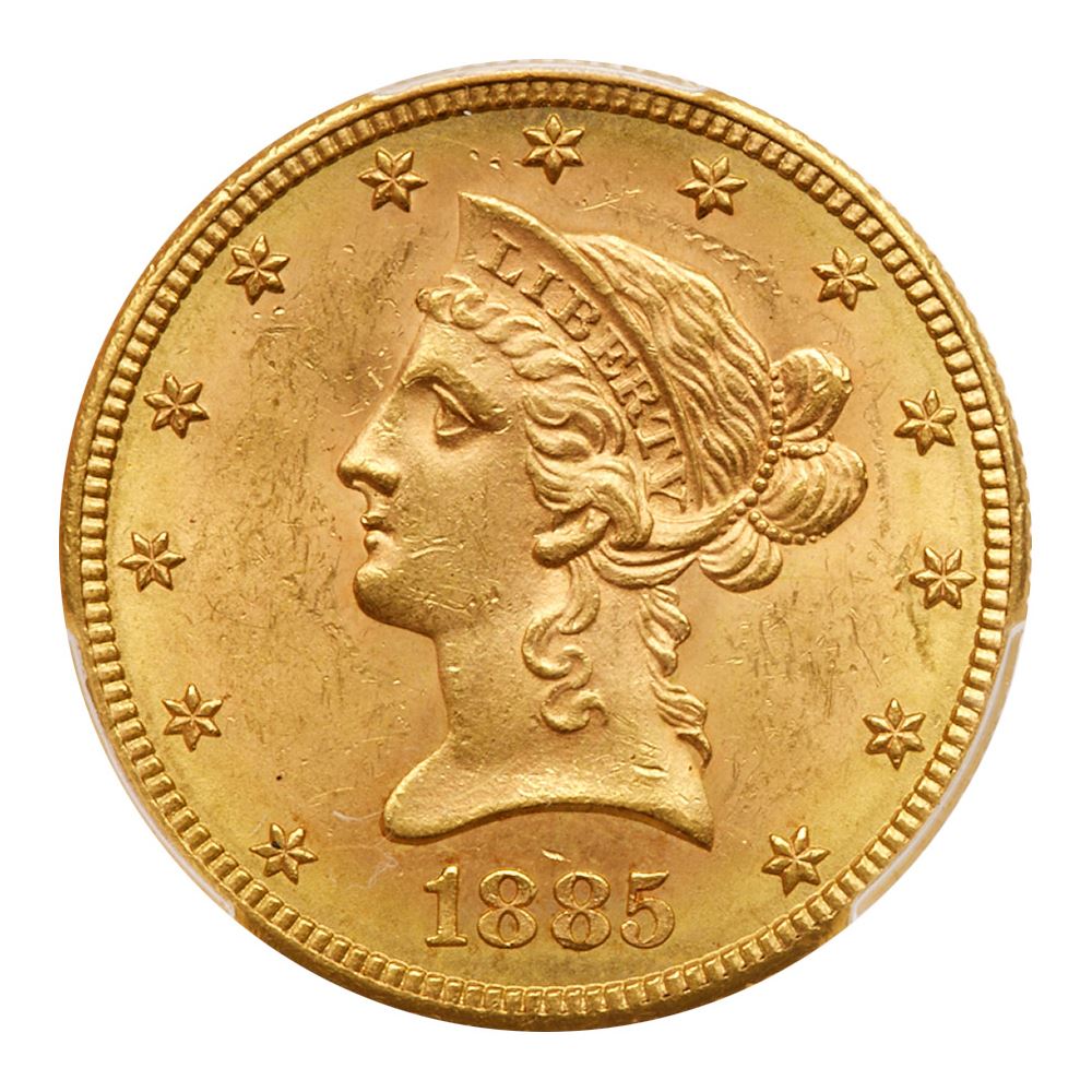 1885-S. PCGS graded MS-64. A nice frosty example that offers wonderful original mint luster with tinges of greenish gold iridescence. The strike is sharp and the surfaces display only a few minor bagmarks, far nicer than what is usually seen on this date and mint. Pop 7; tied for the finest examples graded at both services. PCGS # 8707 Estimated Value 5,000 - UP