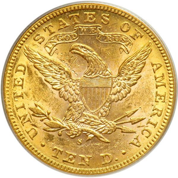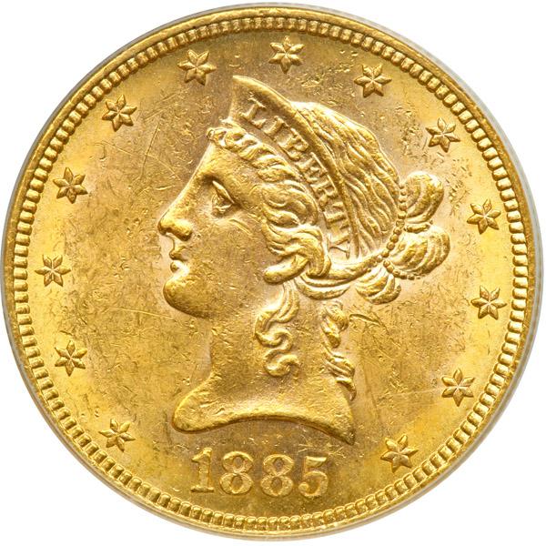 1885-S $10 Liberty. PCGS graded AU-55 PQ. Housed in an Old Green Holder. Light gold toning. Typical high quality strike for this S-mint ten from the year 1885. San Francisco mint's consistent high quality is noteworthy (PCGS # 8707) .