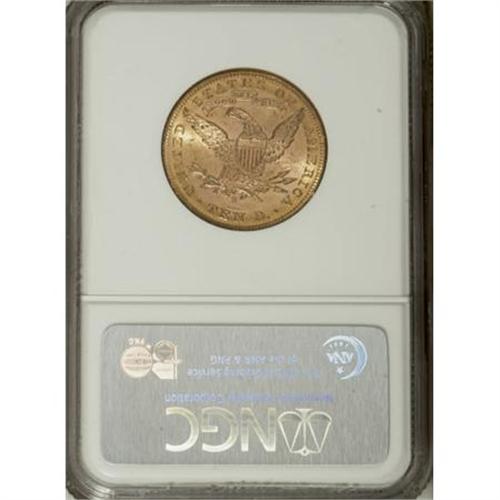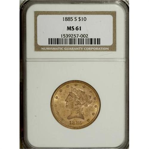<B>1885-S $10 MS61 NGC.</B></I> NGC Census: (239/201). PCGS Population (113/282). Mintage: 228,000. Numismedia Wsl. Price for NGC/PCGS coin in MS61: $525. (#8707)<BR><BR><B>Coin Engraver:</B> Christian Gobrecht<BR><BR><b>Shipping:</b> Coins & Currency (<a target="_blank" href="http://www.heritageauctions.com/common/shipping.php">view shipping information</a>\)