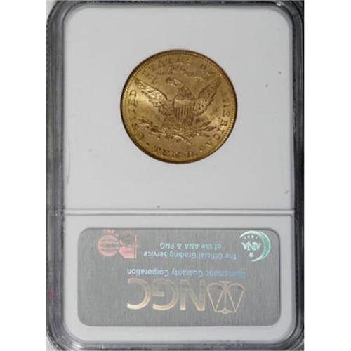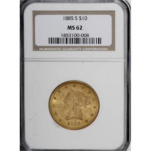 <B>1885-S $10 MS62 NGC.</B></I> NGC Census: (162/39). PCGS Population (227/63). Mintage: 228,000. Numismedia Wsl. Price for NGC/PCGS coin in MS62: $800. (#8707)<BR><BR><B>Coin Engraver:</B> Christian Gobrecht<BR><BR><b>Shipping:</b> Coins & Currency (<a target="_blank" href="http://www.heritageauctions.com/common/shipping.php">view shipping information</a>\)